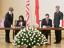 Minister spraw zagranicznych Radosław Sikorski i sekretarz stanu USA Condoleezza Rice podpisali w Kancelarii Prezesa Rady Ministrów umowę w sprawie instalacji w Polsce elementów amerykańskiej tarczy antyrakietowej. Zdaniem premiera dokonano wspólnie prawdziwego przełomu w kwestii bezpieczeństwa Polski i USA Obecność baterii rakiet Patriot, które będą broniły naszego terytorium i również obiektów amerykańskich jest praktycznym wymiarem tego przełomowego porozumienia. Wzmocnienie bezpieczeństwa nastąpi poprzez wspólne działanie w takich obszarach jak współpraca: polityczno-wojskowa, technologiczna, badawcza, przemysłów obronnych oraz wymiany informacji. Oba kraje mają działać wspólnie przeciwko pojawiającym się militarnym i pozamilitarnym zagrożeniom wywołanym przez strony trzecie lub dążyć do minimalizowania ich skutków.