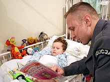 Już ponad miesiąc słuchacze Szkoły Policji w Słupsku odwiedzają małych pacjentów przebywających w Wojewódzkim Szpitalu Zespolonym. Dwa razy w tygodniu, we wtorki i w czwartki, młodzi policjanci po zakończonych zajęciach udają się w czasie wolnym na Oddział Dziecięcy, by czytać bajki. Jak sami mówią, robią to z potrzeby serca, gdyż wielu z nich, na czas półrocznego szkolenia w Słupsku zostawiło w rodzinnych domach dzieci w podobnym wieku. Często zdarza się, że czytanie bajek przekształca się we wspólną zabawę dzieci, policjantów i rodziców, którzy w tym czasie odwiedzają swoje pociechy. Czytanie dzieciom przynosi wiele korzyści obu stronom.