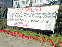 Na zakończenie protestujący uczestnicy debaty przemaszerowali z czarnymi flagami pod wieżę, gdzie pod rozłożonym transparentem ustawili kilkadziesiąt zniczy symbolizujących mieszkańców osiedla, którzy w ciągu ostatnich lat zmarli na nowotwory. (jas)