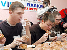 Dziś Tłusty Czwartek. W polskiej tradycji jest to dzień, kiedy na naszych stołach królują pączki i różnego rodzaju słodkości. Słupscy piekarze przygotowali dla łakomczuchów blisko 100 tysięcy tych przysmaków i kilkaset kilogramów różnych drobiazgów. Tradycyjnie już słupska sekcja Polskiego Radia Koszalin zorganizowała ósmą edycję Radiowych Mistrzostw Pączkowych. W tym roku wśród słuchaczy zwyciężył Wojciech Kachnowicz, który w ciągu 10 minut zjadł 15 pączków, zaś w kategorii dziennikarzy wygrał Marcin Prusak z „Głosu Pomorza” - 6 pączków w 5 minut. (mas)